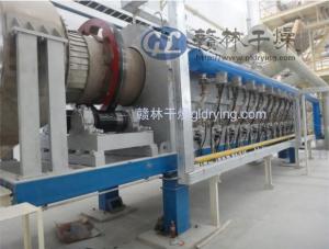 先通过天然气燃烧器在燃烧室燃烧,将旋转的回转滚筒筒体加热均匀。物料通过定量加料器将物料送入回转滚筒内部,通过筒体的旋转和筒体的倾斜度,使物料不断地向前移动。在移动的过程中,加热后的筒体将热量传递给物料,使物料温度上升,产品得到煅烧,煅烧后的产品成高温状态从尾端排出。
