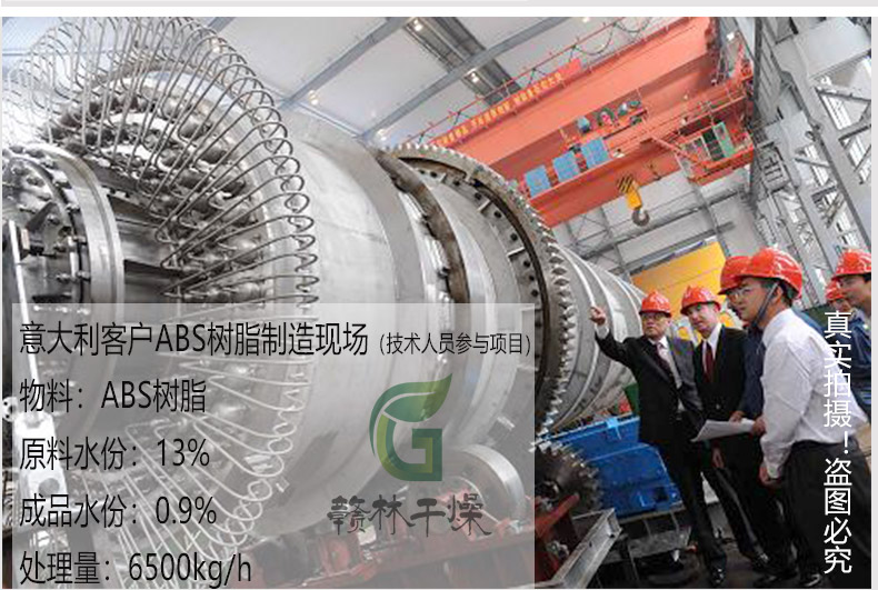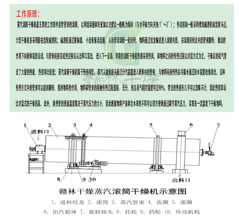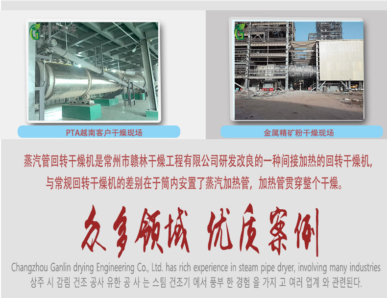 产品简介: 蒸汽间接法滚筒干燥机在化工、食品、粮油等行业普遍应用, 在化工工程中常作为烘干设备使用,相对于传统的回转滚筒干燥机,蒸汽滚筒干燥机单位容积处理量大,热效率高,总能耗相对于常规热风干燥设备,其能耗要比热风干燥设备低30%~40%, 同时没有热风系统设备,设备占地面积小。车间布置也更为简单。 蒸汽管回转干燥机是常州市赣林干燥工程有限公司自行设计研发改良的一种间接加热的回转干燥机,与常规回转干燥机的差别在于筒内安置了蒸汽加热管,加热管贯穿整个干燥。大大提高了设备的干燥效率。
