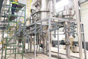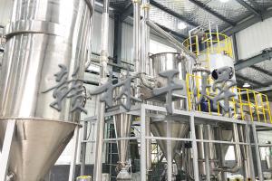 干燥塔包含:塔体、防爆照明灯、气体分布器、温控设备、泄压装置、进风管路、出风管路、氧含量测量传感器等部件,进风管路内部需要设置过滤装置;雾化后的浆料在热空气的加热作用下,浆料完成挥发和干燥成为粉料落向底部的出料口,气体从排风管排除进行闭路循环管路,干燥塔材质:304不锈钢。