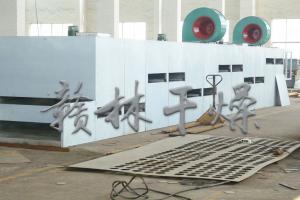 干燥机内热风采用分区单元多个组合而成,每一单元热风独立循环,热风先穿流通过网带后,部分含湿尾气被排湿风机由排湿口排出,每一单元排出废气量均有调节阀控制。大部分热风和补充的新鲜空气一起被循环风机循环至蒸汽(导热油)加热器内,进行循环加热,加热后的热风重新进入到网带内参与干燥。